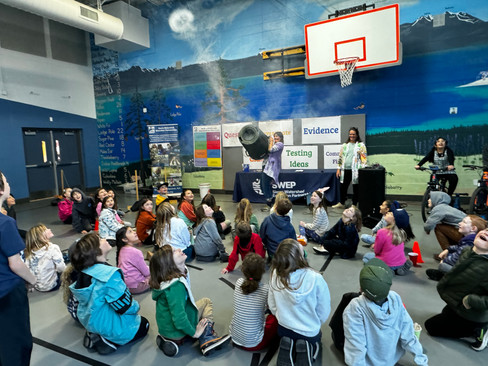 "Can we shape air?” SWEP instructor Jenna asks a group of 60 first graders. They make a claim of yes or no and share any ideas about how they might do so with their small groups. Jenna pulls out a small air cannon, fills it with fog, taps the bottom and we hear the oohs and aahs as the students see the donut shaped rings that fly from it. “We investigated our question and saw evidence that yes, we can shape air. Scientists find that answering one question often leads to even more questions. We asked ourselves, could we make an even bigger ring?” “Yes!” shout the students with anticipation. As we pull out the huge air cannon made with a large trash can the room erupts with cheers and kids can hardly stay seated. We fill the can with fog and all watch as large vortex rings shoot through the air heading all the way to the end of the gym.